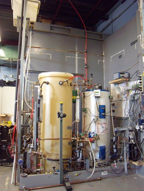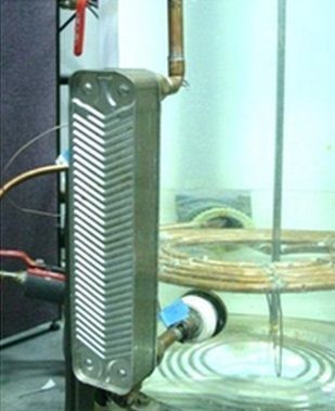 To test natural convection heat exchangers, an experimental procedure was undertaken in a controlled laboratory environment. Two heat exchanger configurations were studied: an external, braised-plate heat exchanger and a spiral heat exchanger located in the storage tank.