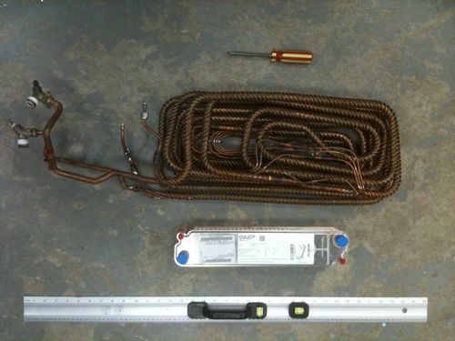 Copper coaxial heat exchanger (above) and a brazed plate heat exchanger (below) designed specifically for trans-critical CO2.